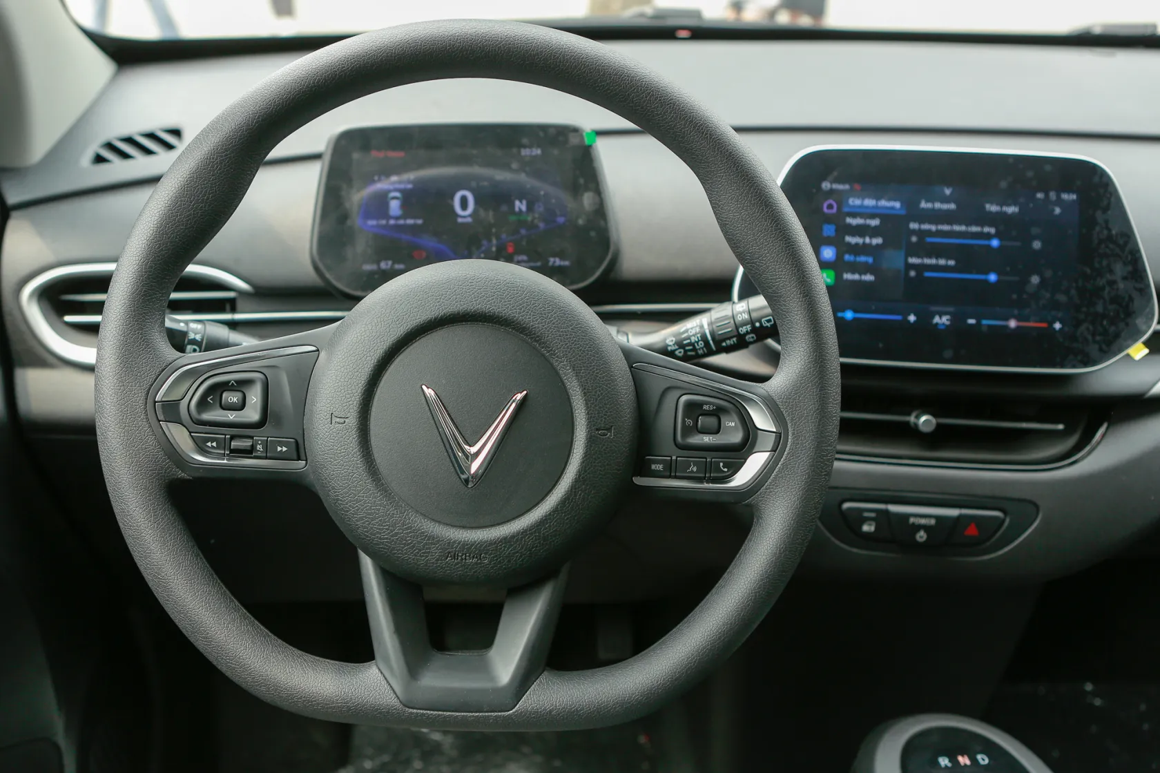 Vốn theo đuổi phong cách thiết kế tối giản nên khoang cabin VF5 trông khá đơn giản nhưng không kém phần hiện đại với sự hiện diện của 2 màn hình điện tử. Trong đó, màn hình phía sau vô-lăng đặt nổi thay cho dạng analog truyền thống và màn hình cảm ứng cỡ lớn ngay trung tâm táp-lô.