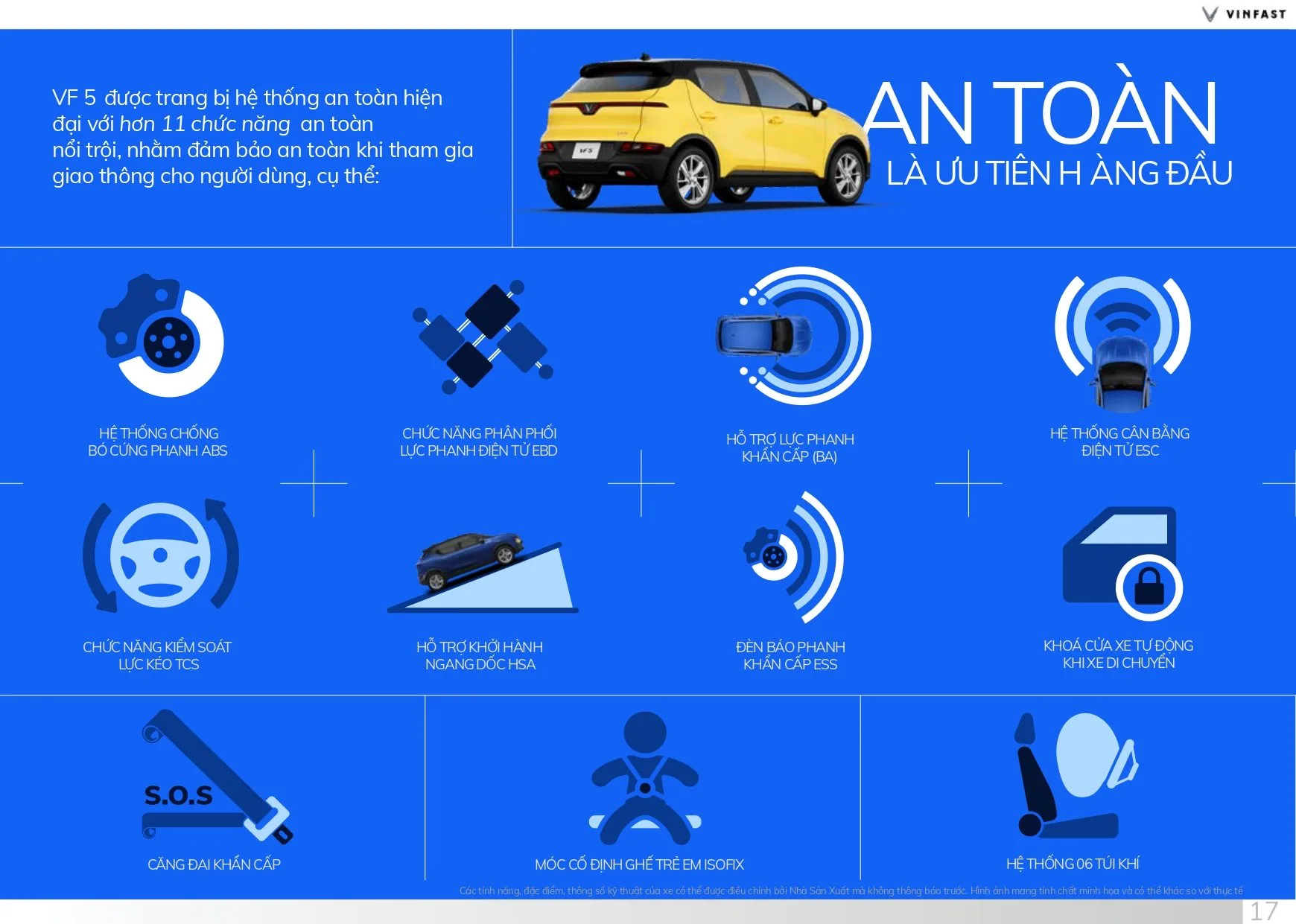 Các tính năng an toàn trê VF5 tiên tiến bậc nhất như: Giám sát hành trình cơ bản, Cảnh báo giao thông phía sau, Cảnh báo điểm mù, Cảnh báo luồng giao thông đến khi mở cửa, Hỗ trợ đỗ xe phía sau, Hỗ trợ phanh khẩn cấp, Hệ thống cân bằng điện tử, Hỗ trợ khởi hành ngang dốc, Giám sát áp suất lốp…